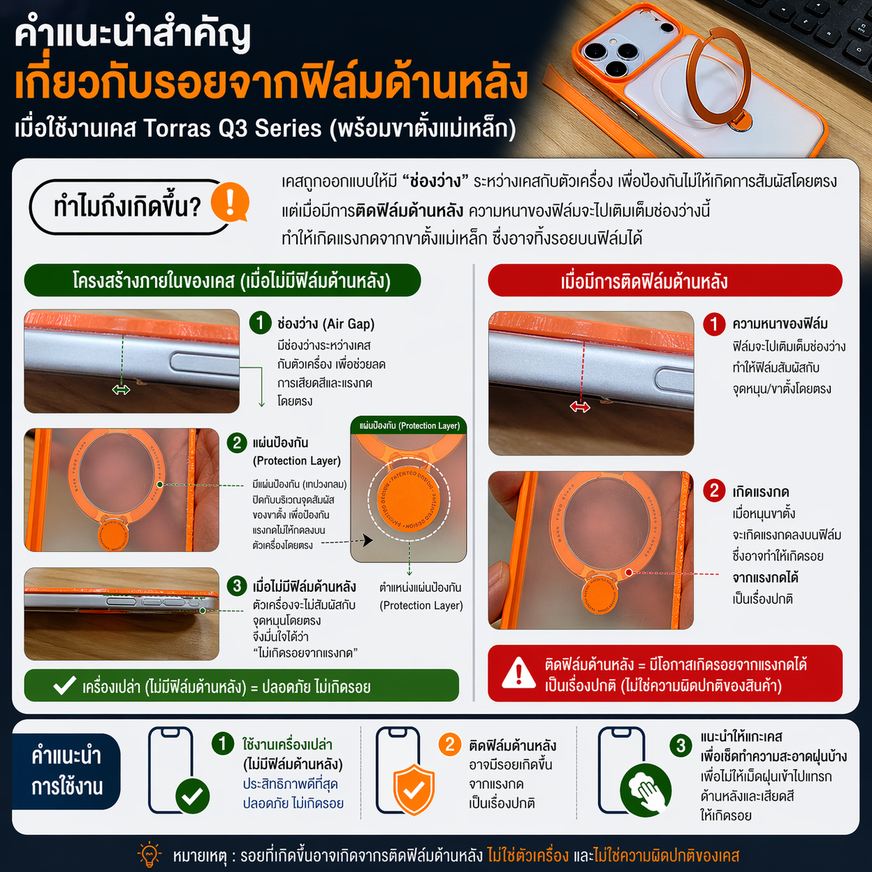 หากสามารถใส่เคสได้ อาจเกิด รอยกดทับที่ฟิล์ม ซึ่งเป็นเรื่องปกติจากความกระชับของตัวเคส